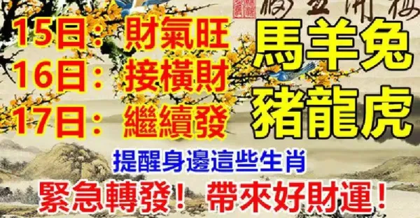 (馬羊兔豬龍虎)15日財氣旺,16日接橫財,17日繼續發