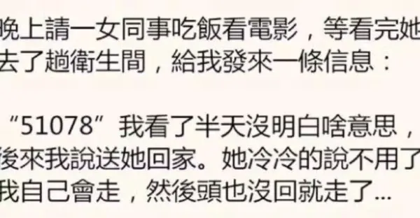 晚上我請女同事吃飯,她去了趟洗手間,給我發來一條訊息,「51078」,我