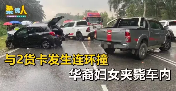 新山 2貨卡發生連環撞, 華裔婦女夾斃車內