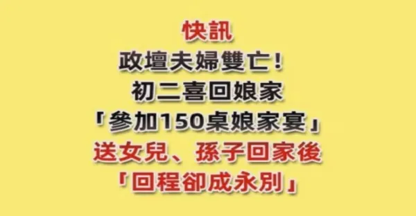 快訊/政壇夫婦雙亡!!! 初二喜回娘家「參加150桌娘家宴」送女兒、孫子回家後「回程卻成永別」