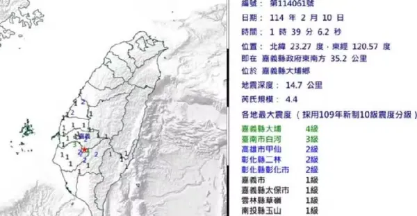 又震了!嘉義大埔凌晨「規模4.4地震」10縣市有感