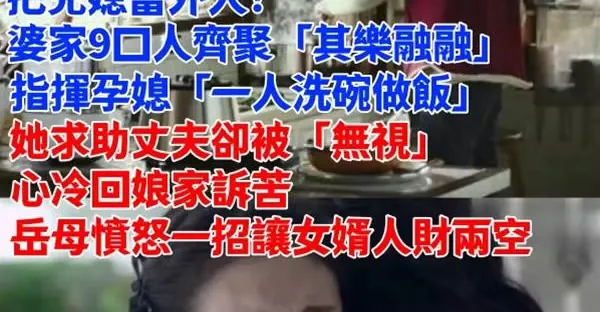 把兒媳當外人!婆家9口人齊聚「其樂融融」 指揮孕媳「一人洗碗做飯」她求助丈夫卻被「無視」心冷回娘家訴苦,岳母憤怒一招讓女婿人財兩空