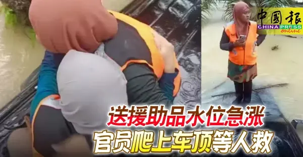 送援助品水位急漲 官員爬上車頂等人救