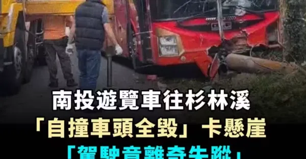 南投遊覽車往杉林溪「自撞車頭全毀」卡懸崖「駕駛竟離奇失蹤」警消到場破門後全場傻眼!!