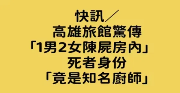 快訊/ 高雄旅館驚傳「1男2女陳屍房內」死者身份「竟是知名廚師」