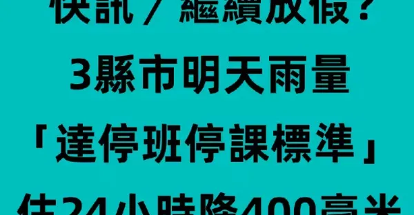 快訊/繼續放假?3縣市明天雨量「達停班停課標準...」  估24小時降400毫米
