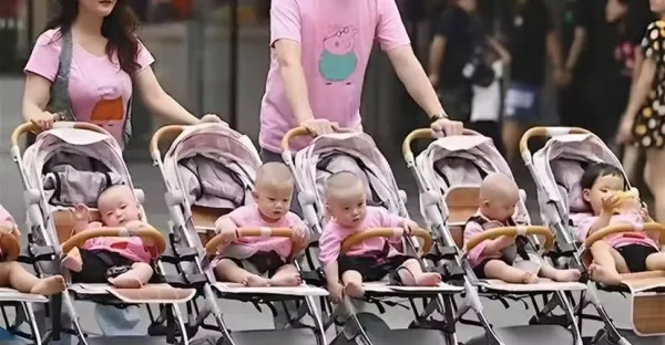 頭胎雙胞胎女兒,二胎四胞胎兒子,小兩口「帶6個娃」逛街:太拉風