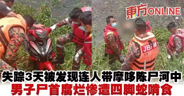 失蹤3天被發現連人帶摩哆陳屍河中 男子屍首腐爛慘遭四腳蛇啃食