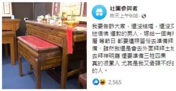 夫妻設有神明廳,逢年過節都要拜!更讓人頭疼的是神明廳設在四樓,每次都要爬上爬下拿貢品,體力真的吃不消!奉勸千萬別嫁「家有神明廳的男人」
