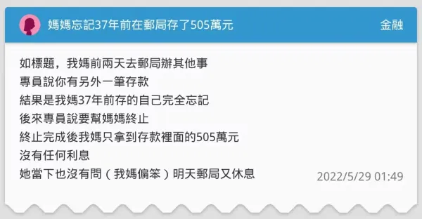 忘記郵局存505萬!天兵媽放37年「領出總金額傻眼」😲急求助「這樣正常嗎」網點破盲點:沒錯啊 # 郵局員工出面解釋