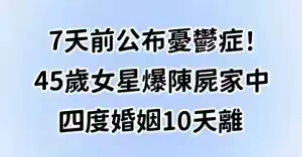 7天前公布憂鬱症!「女星爆陳屍家中」四度婚姻10天離!