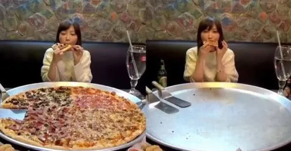 美女大胃王「挑戰82吋披薩」瞬間掃光光 鏡頭拉近後「水杯穿幫了」網傻:難怪吃得完!