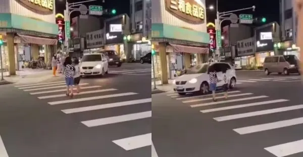 2孩童舉手過馬路 白車轉彎竟不禮讓加速通過!網氣炸:三寶教不會