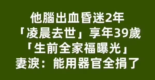 他腦出血昏迷2年「凌晨去世」享年39歲!!! 「生前全家福曝光」妻淚:能用器官全捐了