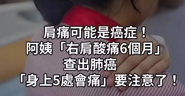肩痛可能是癌癥!阿姨「右肩酸痛6個月」查出肺癌 「身上5處會痛」要注意了.