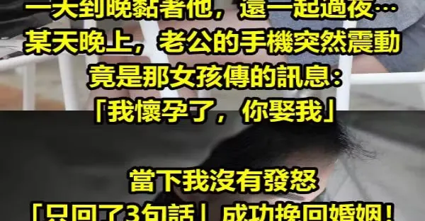 老公公司最近來了一個女新人,一天到晚黏著他,還一起過夜⋯某天晚上,老公的手機突然震動,竟是那女孩傳的訊息:「我懷孕了,你娶我」。當下我沒有發怒「只回了3句話」,成功挽回婚姻!!