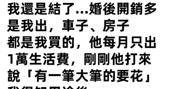我跟老公是姐弟戀,婚前得知他「欠70萬信貸」都拿來吃喝玩樂,我還是結了...婚後開銷多是我出,車子、房子都是我買的,他每月只出1萬生活費,剛剛他打來說「有一筆大筆的要花」我得知用途後....第一次有離婚的念頭