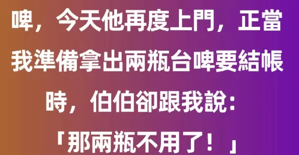 我在超商打工認識一位熟客伯伯,每天都會來買兩瓶台啤,今天他再度上門,正當我準備拿出兩瓶台啤要結帳時,伯伯卻跟我說:「那兩瓶不用了!!」正當我納悶怎麼一回事時,他一開口讓人淚崩了...