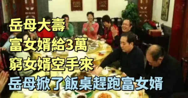 岳母大壽,富女婿給3萬,窮女婿空手來,岳母掀了飯桌趕跑富女婿.