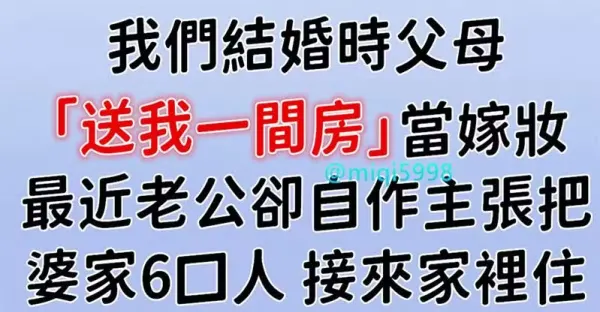結婚時父母「送我一間房」當嫁妝,最近老公卻自作主張把「婆家6口人」接來家裡住!我淡定打了一通電話「隔天門鈴響了」老公全家傻眼…