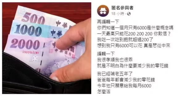 我已經啃老5年,爸爸都會減少我的零用錢,今年開始,他只願意每月給6千,我不明白,我很孝順也很乖,養不起我為什麼要生?想到每月就6千,偷偷哭了好幾次... #詳情見留言