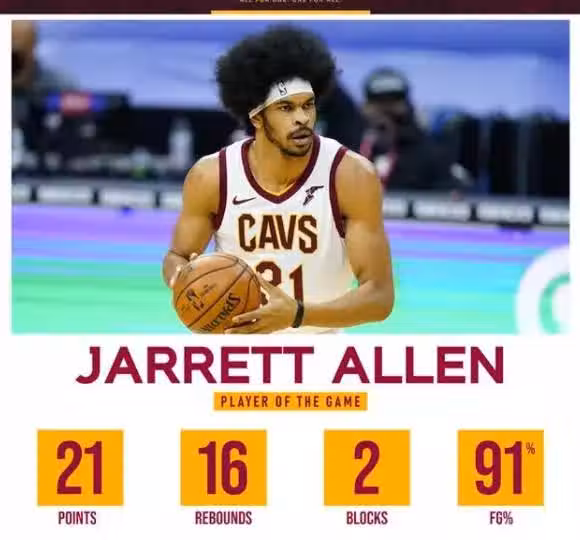 上一位至少得到20分15籃板且命中率達到90%的球員是誰?是2021年2月25日的阿倫,在騎士112比96擊敗火箭的比賽中,他11投10中得到26分18個籃板。再上一位至少得到20分15籃板且命中率達到90%的球員是誰?還是阿倫,2021年2月22日,騎士101比117不敵雷霆,阿倫11投11中得到26分17個籃板。