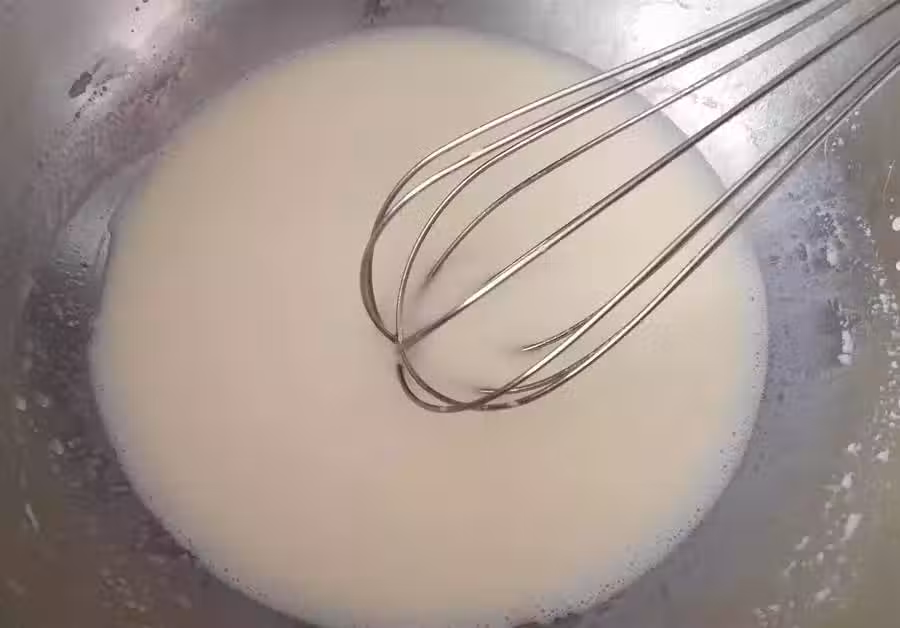 2、先把牛奶倒入盆中,再倒入玉米油,用手動打蛋器攪打均勻,成乳化狀態。