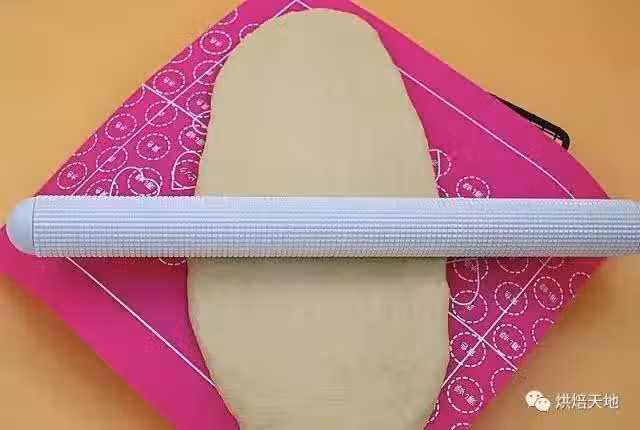 4.發好後的麵糰取出排氣,儘可能搟成長方形(取出的動作不是用手直接去把麵糰扯出來而是用軟刮板或者手指從麵糰的底部往上撈出來)。