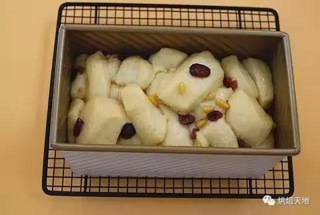 10.烤盤中再放上一杯開水,啟用烤箱發酵檔30分鐘,剩下利用餘溫發酵,發至模具的八分高,輕觸麵糰有少許彈性。