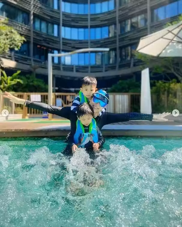 胡杏兒此次出鏡穿了一件十分保守的泳衣,應該是便於帶孩子。她和大兒子愜意地躺在泳池的躺椅上,哪怕包裹嚴實,但她的火辣曲線還是十分惹眼,完全不像是才生下三胎兒子200天的樣子,恢復速度超快。