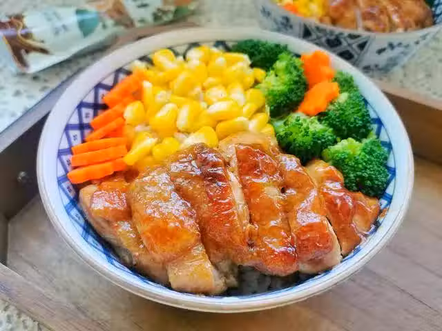 煎好的照燒雞腿切塊碼在米飯上面,放上西藍花、胡蘿蔔和玉米粒,還可以淋些醬汁在雞腿肉上面,這樣一份色香味俱全的照燒雞腿飯就做好了!