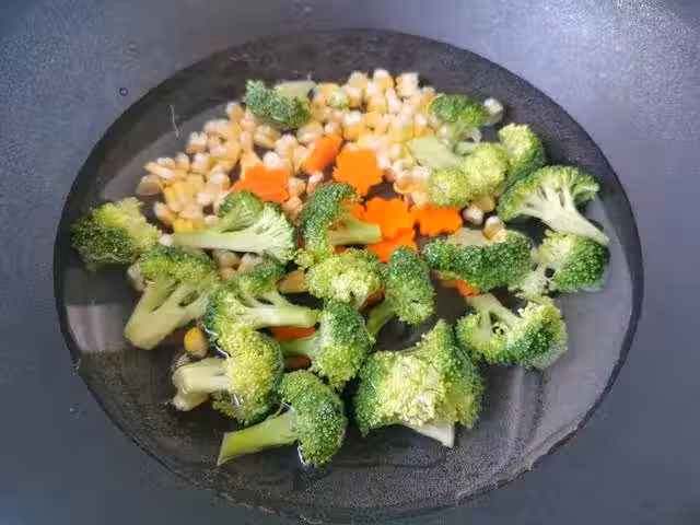 3、鍋中燒水,水開加入一茶匙食用油,放入西藍花、胡蘿蔔和玉米粒煮熟撈出備用。