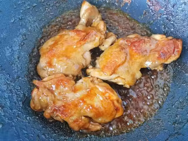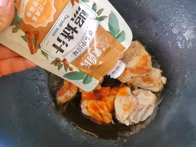 6、倒入100克照燒汁,蓋上鍋蓋小火燜煮5分鐘,讓雞肉入味,添加照燒汁,不需要另外添加任何調味料了。
