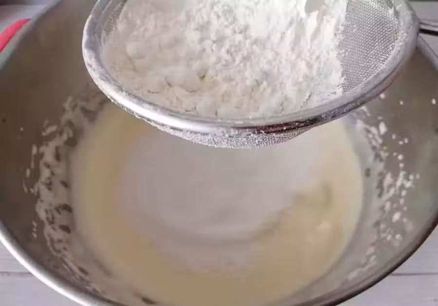 5、然後放入低筋麵粉,記得麵粉一定要過篩。