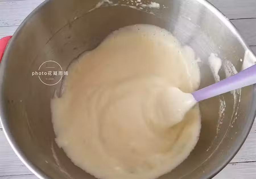 6、用刮刀把麵粉和打發的雞蛋調勻,注意手法,不要畫圈攪拌,以免麵粉起筋了,上下翻拌的手法。