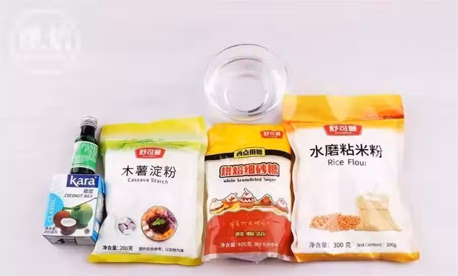 斑斕香精 2g 水 170g 舒可曼優質細砂糖 160g 椰漿 160g 舒可曼木薯澱粉 200g 舒可曼粘米粉 30g