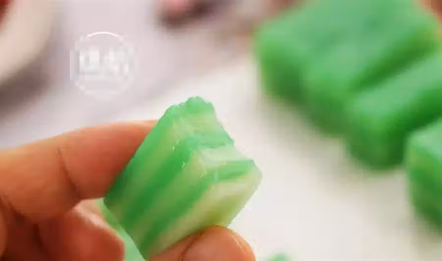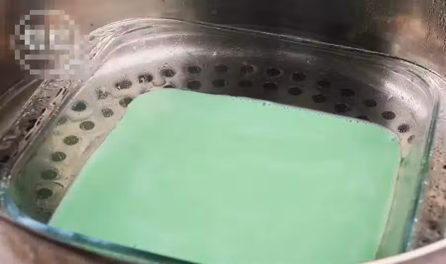 倒入一層薄薄原色粉漿,蒸5分鐘,待凝固後再倒入一層,蒸5分鐘,按照這樣的方法,交替蒸完所有漿液,最後再蒸15分鐘。