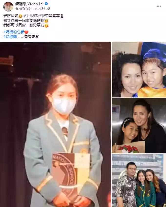 10月18日,知名歌手黎瑞恩罕見在個人社交帳號上曬出一組照片,並配文稱,光陰似箭,一眨眼你已經中學畢業了,希望你每一個重要的時刻,我都可以與你一起分享。網友們看了她的發文後,紛紛留言恭喜。
