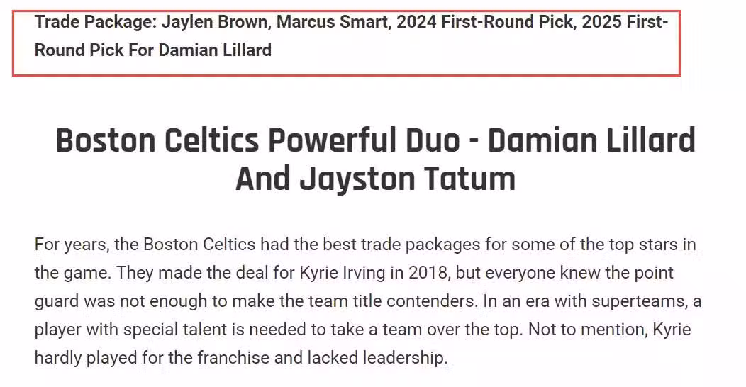 波士頓需要在塔圖姆身邊安插一名像利拉德這樣得分能力爆炸的球員,儘管布朗和斯瑪特的能力不錯,但是在季後賽的舞台上,考驗的是巨星的成色與等級,利拉德有著一顆大心臟,並在過往的季後賽履歷中展現了自己打關鍵球的超級能力,顯然波士頓押寶利拉德值得一試。畢竟,今年東部的局面非常混亂,波士頓完全能促成塔圖姆和利拉德的組合,指不定有意外之喜。