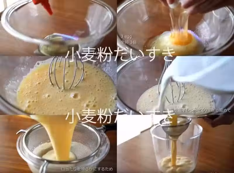 3) 將牛奶蛋液篩過以確保絲滑的口感,並再一次用濾茶器 (tea strainer) 再篩過。篩浩備用。