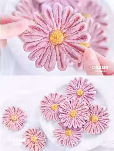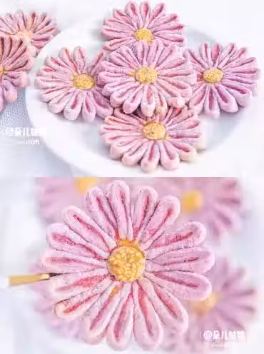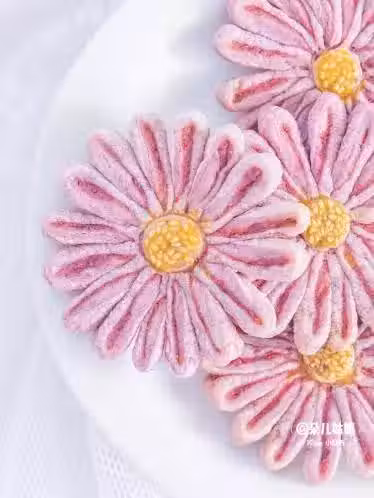 6.搓好的圓球壓成餅狀,用裱花嘴寬的一頭在中心壓出痕跡,用刀將餅胚切成4等份,中間圓心不要切斷,再切成8等份,然後切成16等份,將有餡料的一面轉向上面,將小雛菊的花瓣稍稍壓扁,中間塗上蛋液,撒上幾粒白芝麻
