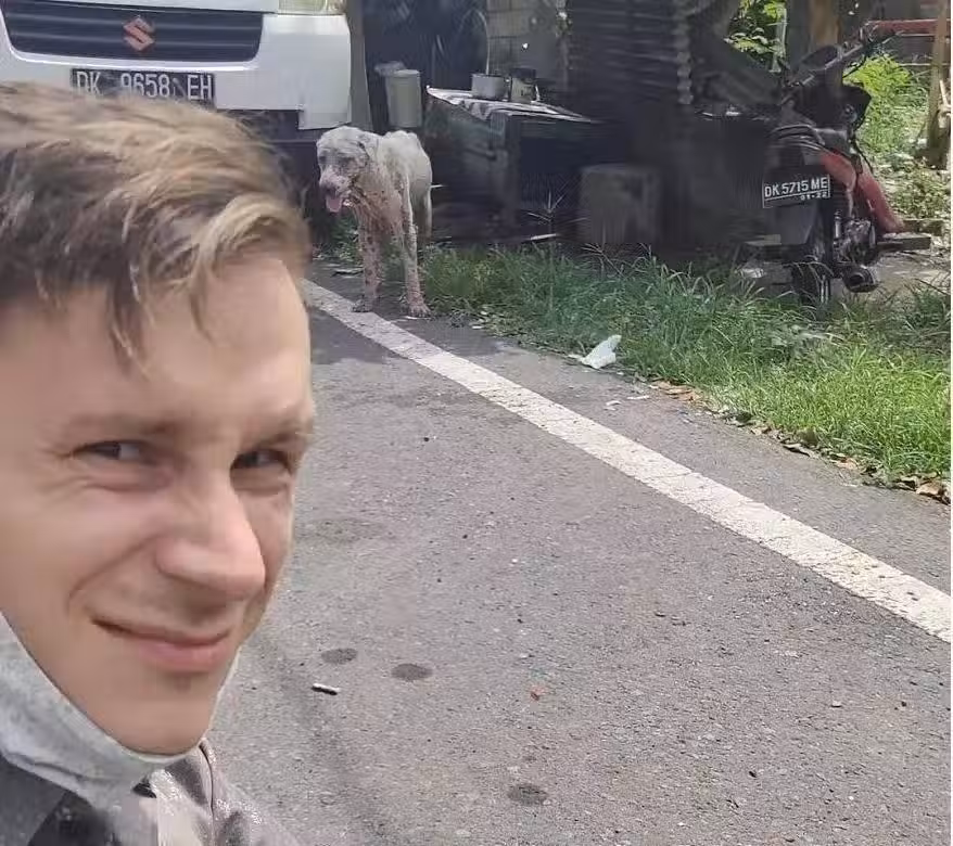 在巴厘島的一處馬路上,車來車往的非常危險,而一隻流浪狗誤闖了進去,似乎被困在了中間。