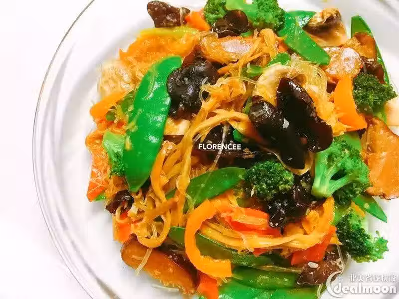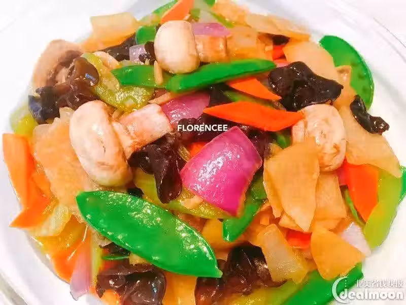 食材:沙葛片、雲耳、胡蘿蔔片、西芹、荷蘭豆、蘑菇蔥薑絲、適量