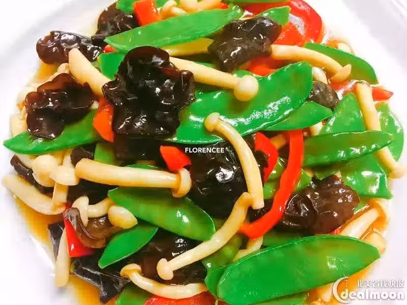 食材:荷蘭豆、白玉菇、雲耳、紅椒絲、薑絲適量
