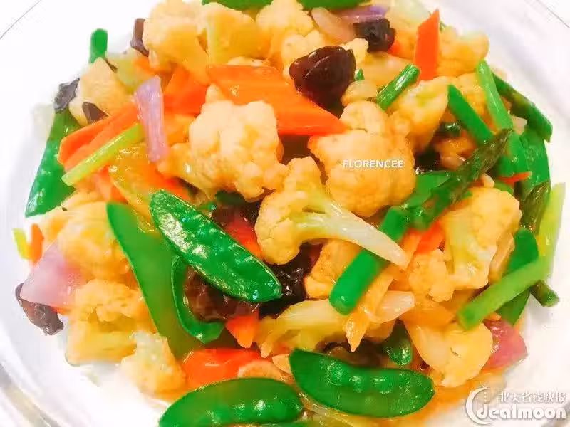 食材:花菜1顆、木耳少許、胡蘿蔔片、蘆筍、荷蘭豆、薑絲各適量