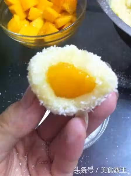 取適量糯米糍放手心,按扁 拿一塊芒果丁放中間 收口,整圓!