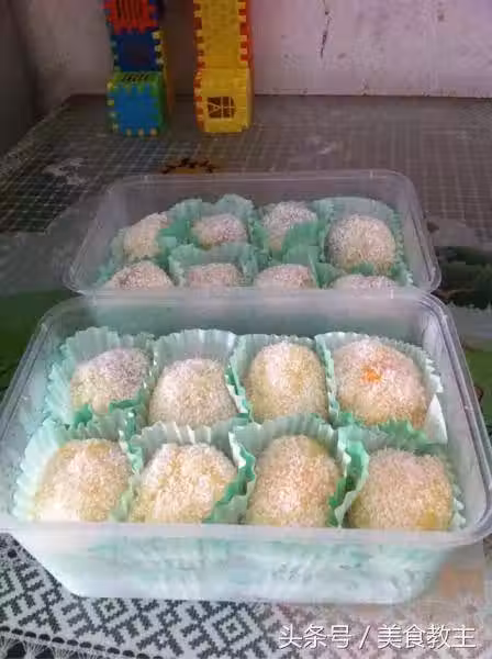 因為糯米糍很粘,所以隨便捏就能收住了,就算餡兒太多撐開了,只要往旁邊捏一捏就 補住了 放椰蓉里打個滾,均勻沾上