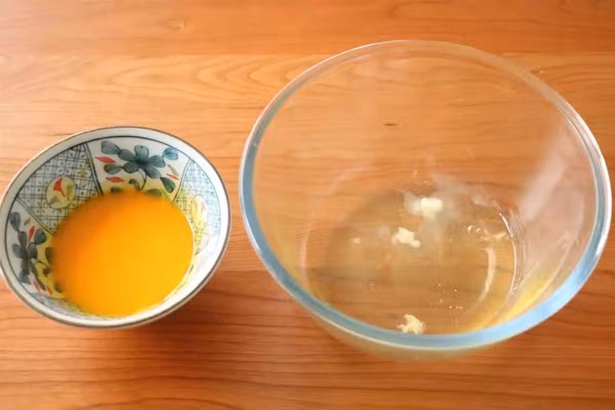 1、3個雞蛋,蛋清蛋黃分離,裝蛋清的盆要乾淨無油無水,蛋黃攪散備用;