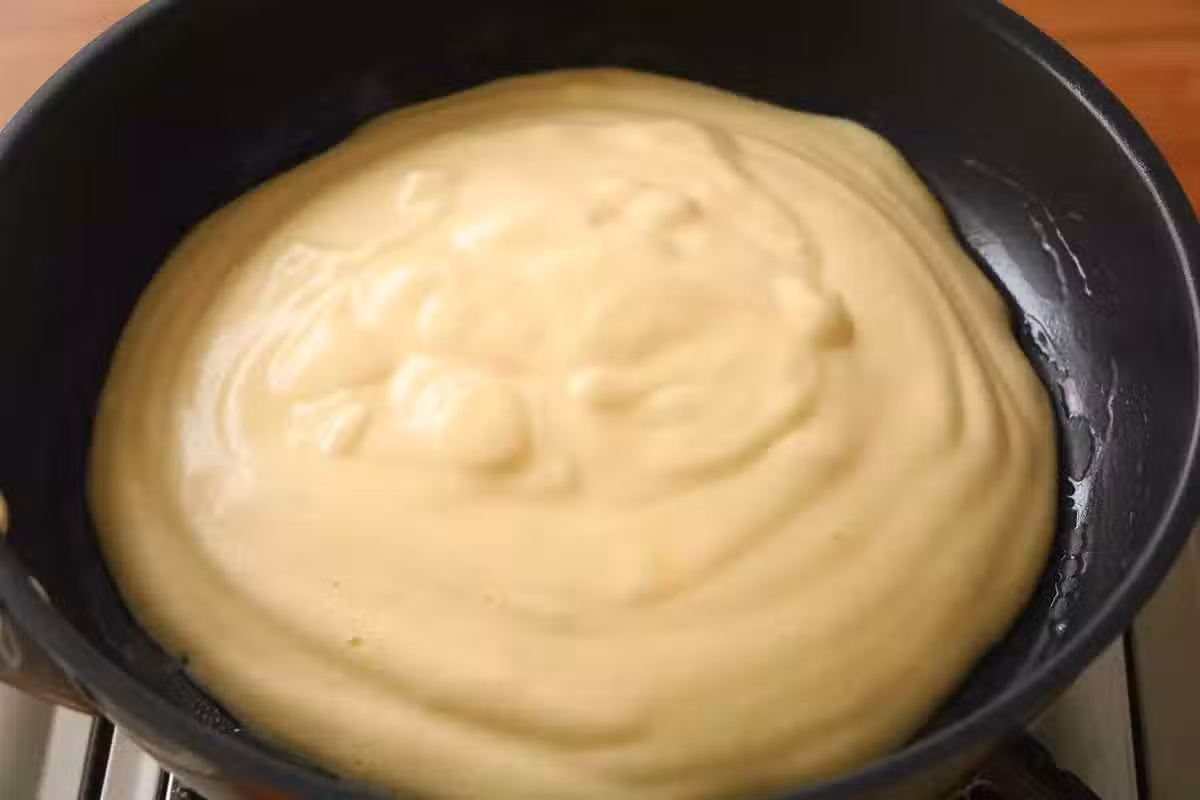 6、平底鍋刷一層黃油,或是沒有味道的食用油,把蛋糊倒進去;