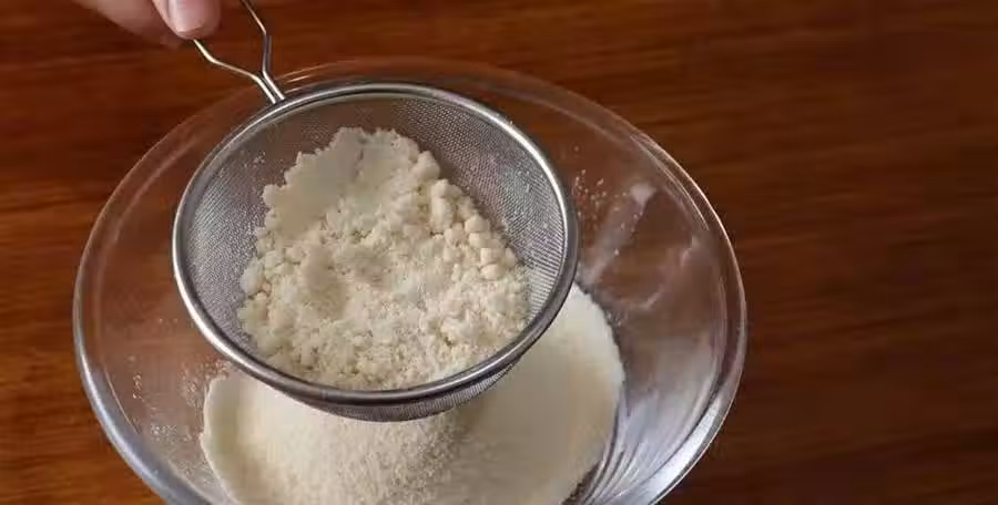 先將糖粉與杏仁粉篩入大碗中,用刮刀拌勻後再過篩一遍。(過濾兩遍會更加細膩。)